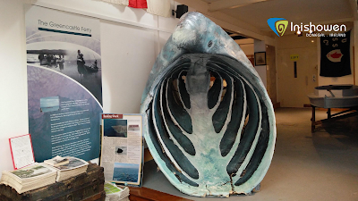 Entering the main exhibition hall you will be greeted by an eye catching replica of a Basking Shark, pictured above, the largest fish species in the North Atlantic and second largest in the world. These gentle giants have been spotted off the coast of Inishowen by locals and visitors. Progressing through the hall you will encounter an impressive collection of boats and other maritime related artefacts, pictured below. Information panels provide the story and context behind the diverse range of objects on display.